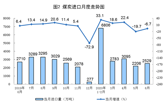 煤炭進(jìn)口下降。6月份,進(jìn)口煤炭2529萬(wàn)噸,環(huán)比增加323萬(wàn)噸,同比下降6.7%;上半年,進(jìn)口煤炭1.74億噸,同比增長(zhǎng)12.7%,比一季度回落15.7個(gè)百分點(diǎn)。