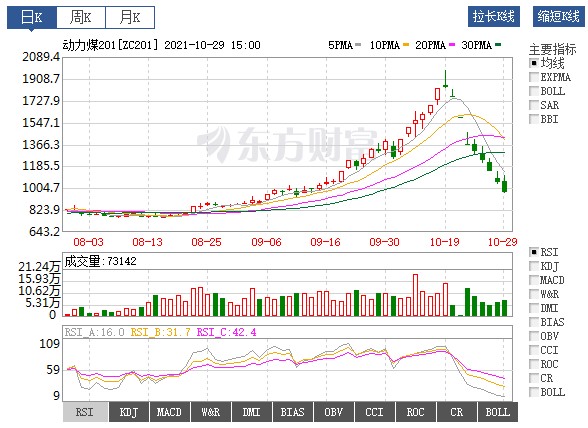 10月28日,受政策監(jiān)管沖擊,煤炭股市、期貨市場(chǎng)延續(xù)跌勢(shì),煤炭概念跳水跌超6%,兗州煤業(yè)( 600188.SH )等多股跌停。商品期貨方面,動(dòng)力煤跌2.25%,而在此之前的幾個(gè)交易日,以鄭商所動(dòng)力煤為例,其價(jià)格直接攔腰斬?cái)?,?0月19日每噸1982元高點(diǎn)直落至10月28日夜間收市的1041元。