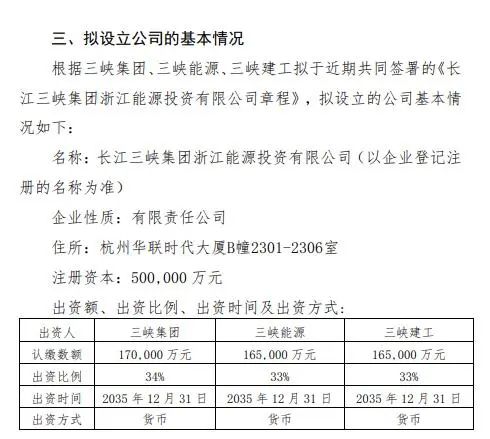 本網(wǎng)訊  4月19日,三峽集團浙江能源投資有限公司成立,法定代表人為陳逸詩,注冊資本50億元,經(jīng)營范圍包含:股權(quán)投資;風力發(fā)電技術(shù)服務(wù);太陽能發(fā)電技術(shù)服務(wù);生態(tài)恢復(fù)及生態(tài)保護服務(wù)等。股權(quán)穿透顯示,該企業(yè)由中國長江三峽集團有限公司、中國三峽建工(集團)有限公司、三峽能源共同持股。