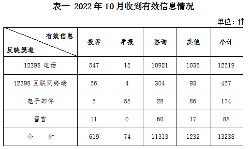 2022年10月,國家能源局12398能源監(jiān)管熱線(以下簡稱12398熱線)共收到有效信息13238件(包含投訴、舉報(bào)、咨詢和其他訴求類別),環(huán)比減少6.23%,同比增加24.69%。(2022年10月收到有效信息情況見表一)