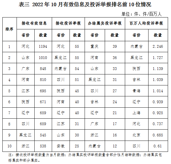 各省(自治區(qū)、直轄市)按照接收的有效信息數(shù)量排序,河北、山東、廣東、河南、江蘇、陜西、遼寧、四川、黑龍江、浙江排在全國前10位;按照接收的投訴舉報(bào)數(shù)量排序,河北、黑龍江、內(nèi)蒙古、四川、陜西、河南、遼寧、江蘇、山東、安徽排在全國前10位;按照辦結(jié)屬實(shí)的投訴舉報(bào)數(shù)量排序,重慶、河南、山東、黑龍江、四川、吉林、遼寧、廣東、浙江、內(nèi)蒙古排在全國前10位;按照百萬人均投訴舉報(bào)數(shù)量排序,內(nèi)蒙古、黑龍江、陜西、吉林、青海、遼寧、上海、河北、北京、四川排在全國前10位。(2022年10月有效信息及投訴舉報(bào)排名前10位情況見表三)