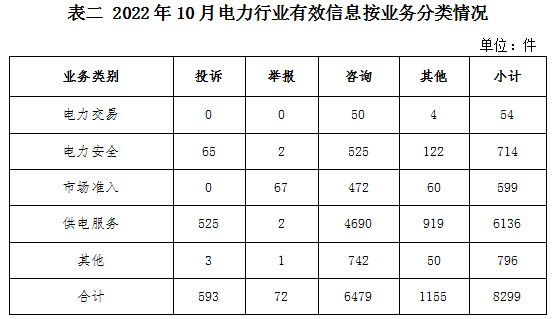 電力行業(yè)排在首位,有效信息數(shù)量為8299件,占全部有效信息的62.69%。群眾關(guān)注的內(nèi)容主要集中在供電服務(wù)、電力安全、市場準(zhǔn)入等方面。(2022年10月電力行業(yè)有效信息按業(yè)務(wù)分類情況見表二)