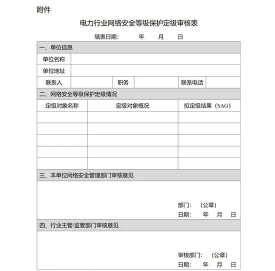 第九條 電力企業(yè)辦理網(wǎng)絡(luò)安全等級(jí)保護(hù)定級(jí)審核手續(xù)時(shí),應(yīng)當(dāng)提交《電力行業(yè)網(wǎng)絡(luò)安全等級(jí)保護(hù)定級(jí)審核表》(詳見(jiàn)附件),含各定級(jí)對(duì)象的定級(jí)報(bào)告及專(zhuān)家評(píng)審意見(jiàn)。