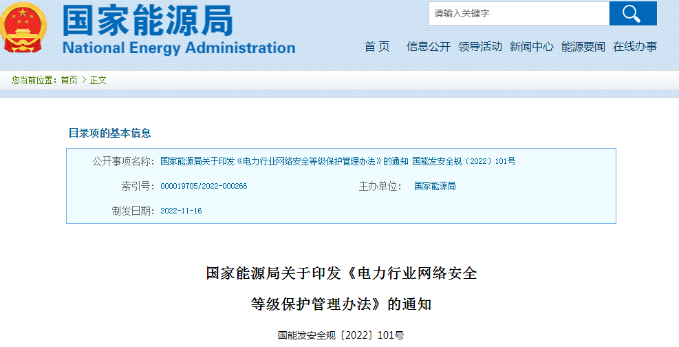 12月12日,國(guó)家能源局發(fā)布《電力行業(yè)網(wǎng)絡(luò)安全等級(jí)保護(hù)管理辦法》。