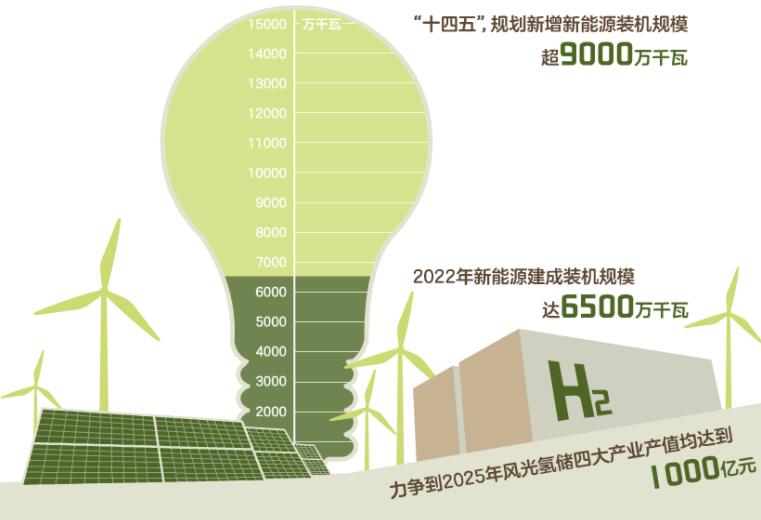 2022年,內(nèi)蒙古新能源建成裝機規(guī)模達到6500萬千瓦,連續(xù)兩年成為全國唯一一個風(fēng)電光伏發(fā)電量超過1000億千瓦時的省區(qū)。“十四五”期間,內(nèi)蒙古規(guī)劃新增超過9000萬千瓦的新能源裝機規(guī)模,力爭到2025年風(fēng)光氫儲四大產(chǎn)業(yè)產(chǎn)值均達到1000億元。