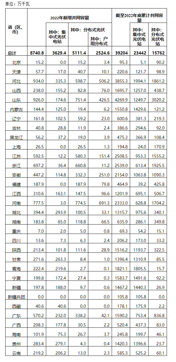 3.2022年部分省(自治區(qū)、直轄市)裝機(jī)有退運(yùn)減容,截至2022年底累計(jì)并網(wǎng)容量按當(dāng)年凈增并網(wǎng)容量統(tǒng)計(jì)。