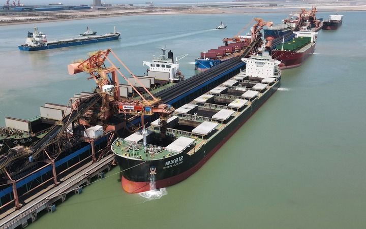 6月27日,船舶在黃驊港煤炭港區(qū)裝運(yùn)電煤(無人機(jī)照片)。