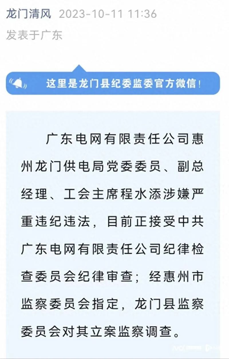 廣東電網(wǎng)有限責(zé)任公司惠州龍門供電局黨委委員、副總經(jīng)理、工會主席程水添涉嫌嚴重違紀違法,目前正接受中共廣東電網(wǎng)有限責(zé)任公司紀律檢查委員會紀律審查,經(jīng)惠州市監(jiān)察委員會指定,龍門縣監(jiān)察委員會對其立案監(jiān)察調(diào)查。
