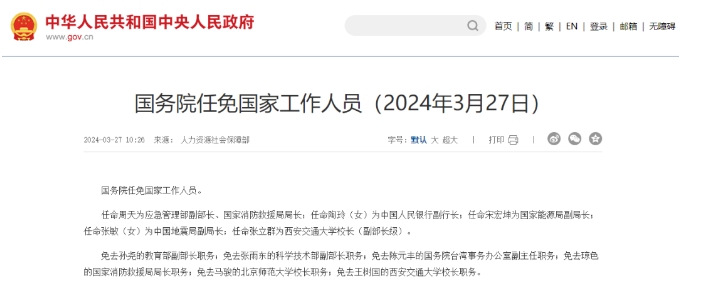 任命宋宏坤為國家能源局副局長;任命張敏(女)為中國地震局副局長;任命張立群為西安交通大學(xué)校長(副部長級)。