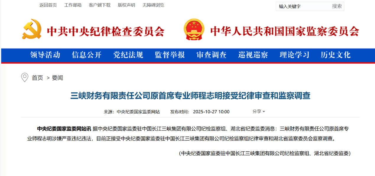 10月27日,中央紀委國家監(jiān)委網站信息顯示,據中央紀委國家監(jiān)委駐中國長江三峽集團有限公司紀檢監(jiān)察組、湖北省紀委監(jiān)委消息:三峽財務有限責任公司原首席專業(yè)師程志明涉嫌嚴重違紀違法,目前正接受中央紀委國家監(jiān)委駐中國長江三峽集團有限公司紀檢監(jiān)察組紀律審查和湖北省監(jiān)察委員會監(jiān)察調查。