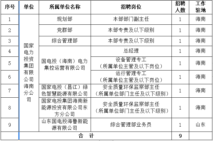 詳見(jiàn)《國(guó)家電力投資集團(tuán)有限公司海南分公司所屬單位招聘崗位職責(zé)及任職條件》(附件1)。