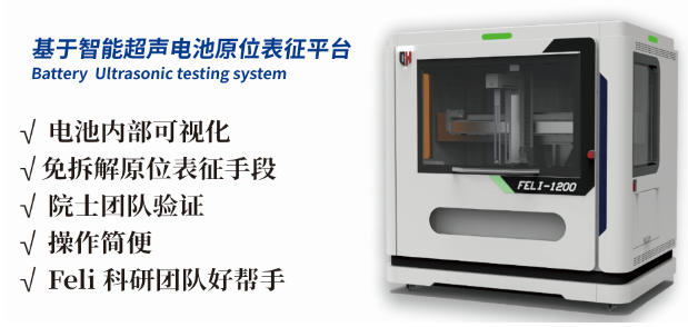 Feli 系列電池超聲波檢測系統(tǒng)是一種無損原位表征手段,廣泛應(yīng)用于電池生產(chǎn)廠、高校、研究院所,以及電池回收利用等領(lǐng)域,可用于電池研發(fā)實驗室,生產(chǎn)工藝室、質(zhì)量部、生產(chǎn)過程的抽檢、出廠檢測、電池安全壽命預(yù)測等部門。