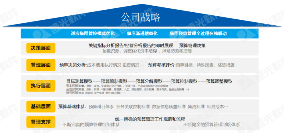管理支撐層面:預(yù)算管理從本質(zhì)上是“一把手”工程,需要公司預(yù)算管理委員會、預(yù)算管理辦公室等預(yù)算管理組織的大力保障,需要制定健全的預(yù)算管理制度、統(tǒng)一明確的預(yù)算工作規(guī)范及流程;