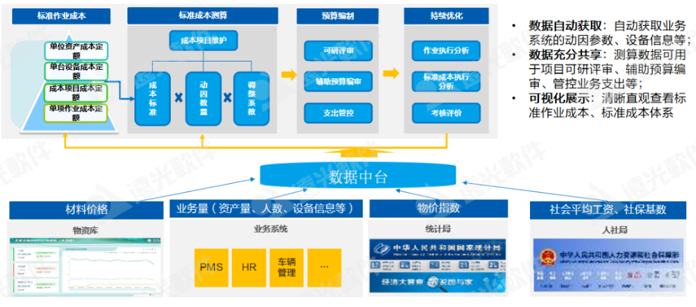 遠光軟件全面預(yù)算管理通過打造涵蓋各板塊、各業(yè)務(wù)的企業(yè)級成本標(biāo)準(zhǔn)庫,輔助企業(yè)預(yù)算編制,提高企業(yè)預(yù)算編制的準(zhǔn)確性及公平性,并通過連接統(tǒng)計局、物價局相關(guān)數(shù)據(jù)指標(biāo),快速采集和更新動因數(shù)據(jù),實現(xiàn)標(biāo)準(zhǔn)成本的動態(tài)修編,提高標(biāo)準(zhǔn)成本體系的適用性、精準(zhǔn)性。