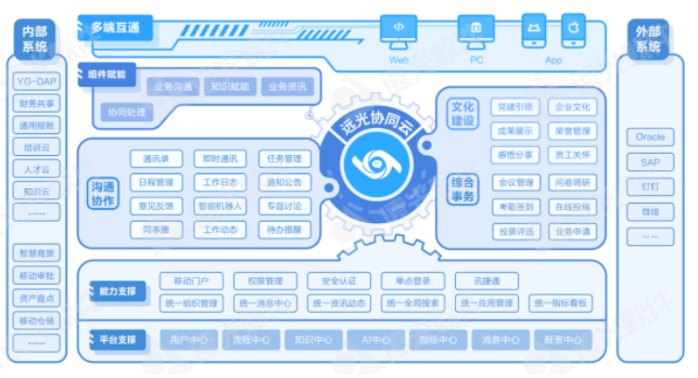 遠(yuǎn)光協(xié)同云以移動(dòng)端協(xié)同為核心,融合內(nèi)外部應(yīng)用,支持企業(yè)以搭積木形式取用文化建設(shè)、溝通協(xié)作、綜合事務(wù)等多類應(yīng)用,為企業(yè)構(gòu)建社交化、移動(dòng)化、云端化、智能化的協(xié)作創(chuàng)新生態(tài)圈。