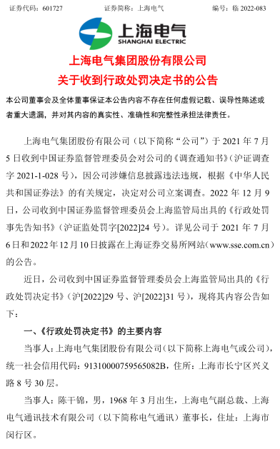 上海電氣12月25日晚間公告稱,近日,公司收到上海證監(jiān)局出具的《行政處罰決定書》,因未及時披露相關(guān)重大事件、2020年年報(bào)存在虛假記載,被警告并罰款500萬元;對上海電氣副總裁、電氣通訊董事長陳干錦給予警告,并處50萬元罰款。