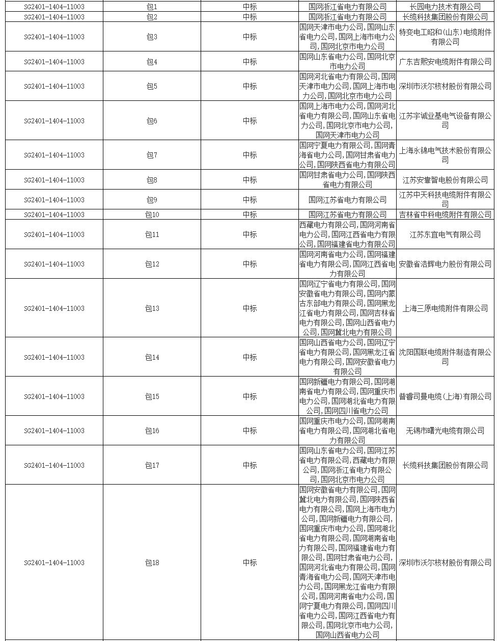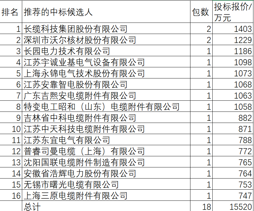 根據(jù)此前(2024年3月7日)推薦的中標(biāo)候選人公示,共招18包15520萬元,16家供應(yīng)商中標(biāo)。長纜科技、沃爾核材中標(biāo)2包,其余供應(yīng)商中標(biāo)1包。中標(biāo)金額分布較為均衡,10家過800萬元,8家過1000萬元,長纜科技最高,1403萬元,三原電纜附件最低,747萬元。