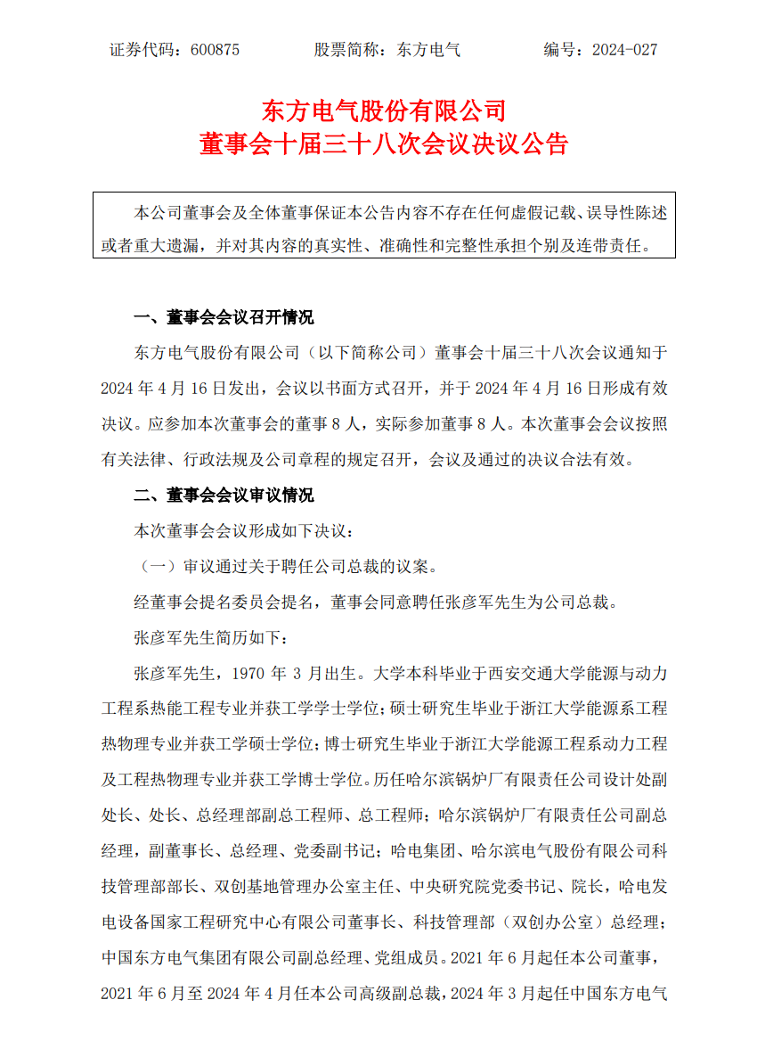張彥軍任東方電氣股份有限公司(以下簡稱“東方電氣”)總裁。