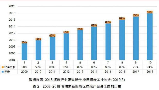 在供給側(cè)結(jié)構(gòu)性改革政策的推動(dòng)下,煤炭產(chǎn)能集中度進(jìn)一步提高。十八大以來,國(guó)務(wù)院相繼出臺(tái)了關(guān)于深化煤炭市場(chǎng)化改革的一系列文件,增大了煤炭去產(chǎn)能力度,截至到2018年底,基本上提前完成了“十三五”煤炭去產(chǎn)能8億噸的計(jì)劃,淘汰關(guān)閉了一大批不合標(biāo)準(zhǔn)的煤礦。同時(shí),為了滿足日益增長(zhǎng)的能源市場(chǎng)需要,新建、擴(kuò)建、技改一批現(xiàn)代化礦井,產(chǎn)能已達(dá)到14.96億噸。據(jù)中國(guó)煤炭工業(yè)協(xié)會(huì)統(tǒng)計(jì),全國(guó)煤礦數(shù)量從2015年的1.08萬處減少到目前的5800處,年產(chǎn)能120萬噸及以上的大型煤礦產(chǎn)量超過80%,年產(chǎn)能30萬噸及以下小型煤礦減少至10%以下。煤炭開采向大型煤炭基地集中,其產(chǎn)量占全國(guó)總產(chǎn)量的95%以上,5000萬噸級(jí)以上大型礦井產(chǎn)量占60%以上。煤炭生產(chǎn)布局進(jìn)一步向晉、陜、蒙、新地區(qū)等地區(qū)集中。2018年,內(nèi)蒙古、山西、陜西、新疆、貴州、山東、河南、安徽等8個(gè)億噸級(jí)規(guī)模以上企業(yè)原煤產(chǎn)量達(dá)31.2億噸,占全國(guó)的88.1%,其中,晉、陜、蒙、新四省(區(qū))原煤產(chǎn)量占全國(guó)的74.3%。見圖1、圖2。