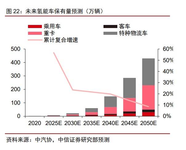 我們預計隨著氫能車的降本疊加經(jīng)濟的恢復,2023年銷量或超過9000輛,其中大型客車及大型卡車銷量分別為1250、2000輛左右;輕型貨車或物流車由于種類多、應用場景豐富,依然是銷量最多的車型,預計銷量接近6000輛。