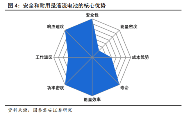 液流電池具備兩大核心優(yōu)勢:1)安全:從根本上避免爆燃,2)耐用:活性物質(zhì)衰減緩慢,工作壽命長達(dá)15-20年,加之儲能系統(tǒng)一般是靜態(tài)設(shè)施,對重量、體積的要求不高,能量密度并非關(guān)鍵指標(biāo),使得其尤其適合作為大規(guī)模儲能系統(tǒng)。