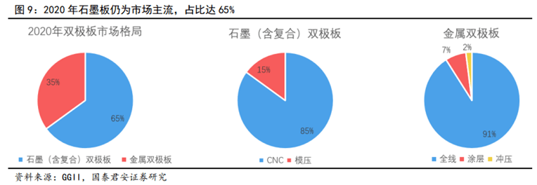 市場格局:仍以石墨板為主,金屬板或后來居上。氫燃料電池方面,2020年我國氫燃料電池雙極板市場規(guī)模達3.1億元,石墨板(包含碳塑復合板)和金屬板的市場占比分別為65%和35%,2021年石墨雙極板與金屬雙極板趨于平分秋色。GGII數(shù)據(jù)顯示,2021年H1金屬雙極板出貨量在雙極板總出貨量的占比已達45.0%(2020年同期為36.0%)。釩液流電池方面,基本不考慮金屬板,即使是涂層處理后的金屬板,在酸性液體環(huán)境中也難以長期穩(wěn)定工作。石墨雙極板(機加工)不被看好,因為其機加工過程復雜且成本高。釩液流電池主要采用碳塑復合板,因為其熱塑或模壓工藝相對機加工簡單,但是混合高分子樹脂所帶來的電阻率增加仍是需要解決的問題。