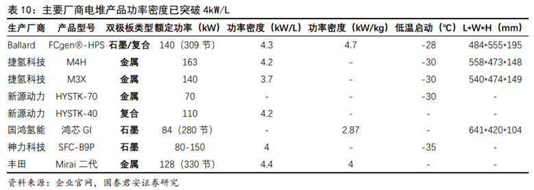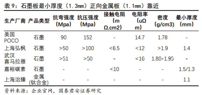 石墨板適應需求趨于薄型化,乘用車為金屬板帶來機遇。石墨板:由于其高耐腐蝕性、高耐久性,以及相對較低的技術壁壘,率先實現(xiàn)國產化,在對體積較不敏感而對耐久性敏感的特種車、商用車領域示范應用。然而,石墨雙極板的制作周期長、機械性能差、加工難度大、制作成本高等劣勢也不可忽視。市場已有越來越多的企業(yè)成功開發(fā)出超薄超精細石墨雙極板,提前突破了國家制定2025年前單組石墨雙極板厚度1.5mm的要求,功率密度開始接近豐田第一代金屬雙極板的水平。金屬板:抗腐蝕性差,壽命過短是其應用的阻礙,然而隨著涂層工藝的持續(xù)進步與突破,其有望實現(xiàn)和石墨板相同的使用壽命。豐田汽車公司率先在旗下Mirai燃料電池汽車上使用金屬雙極板和涂層,解決了腐蝕、成本和導電等一系列問題。憑借其機械性能優(yōu)異、高體積功率密度、成本低廉且易批量生產等優(yōu)勢,金屬雙極板將在乘用車規(guī)?;瘧玫倪M程中實現(xiàn)突破。