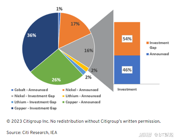 根據(jù)國際能源署(IEA)的數(shù)據(jù),關鍵礦產所需的投資在3600億至4500億美元之間??紤]到已宣布的項目,目前的投資缺口為54%,即1940億美元至2430億美元。目前,投資缺口最大的礦產是銅,占36%,其次是鎳,占16%。