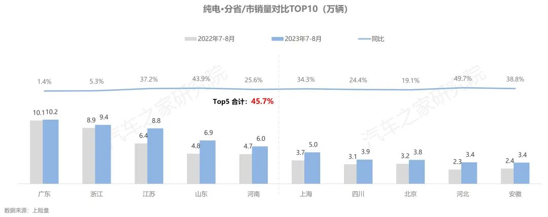 從省份角度看,在排名前五的省份中,廣東省是唯一銷量超過(guò)10萬(wàn)輛的省份,繼續(xù)占據(jù)首位,排名第二至第五名的浙江、江蘇、山東、河南,五省合計(jì)占近50%的全國(guó)市場(chǎng)份額。排名前10的省份中,山東、河北省的市場(chǎng)成長(zhǎng)性最為優(yōu)異,今年7-8月銷量同比增速近50%。
