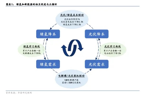華泰證券最近有篇報告,畫了一張光伏和綠氫成本聯(lián)動的圖。核心的意思就是光伏降本遵循摩爾定律,而綠氫由光伏電解水制成,光伏降本會帶來綠氫成本的不斷下降,隨著綠氫成本的下降,就會解鎖越來越多的應用,反過來又會帶動光伏的需求。這是一個循環(huán)。