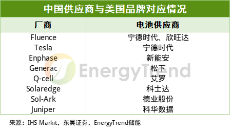 美國(guó)戶儲(chǔ)以本土品牌為主,中國(guó)供應(yīng)商占比逐步提升。2021年美國(guó)戶用市場(chǎng)中,Tesla、BYD、Enphase分列前三,國(guó)內(nèi)產(chǎn)業(yè)鏈占比提升。特斯拉采用寧德100ah的方形電池;Enphase采用新能安52ah的軟包電池。