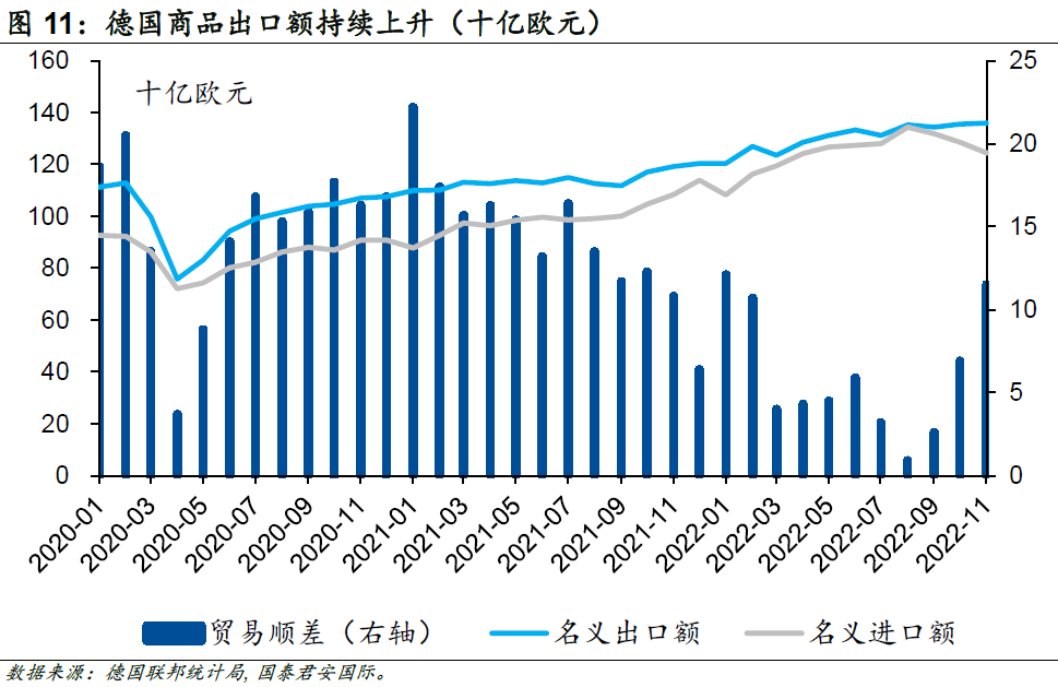 進(jìn)一步看,隨著疫情的相對穩(wěn)定,個人消費支出增長4.6%,對GDP增長起到了核心支撐作用。經(jīng)價格調(diào)整后,2022年德國商品出口額和進(jìn)口額比上年分別增長3.2%和6.7%。作為德國最為重要的貿(mào)易伙伴,中國的貿(mào)易數(shù)據(jù)已經(jīng)在2022年下半年明顯下滑,這也意味著支撐德國貿(mào)易的主要力量來自于歐元區(qū)自身以及其他主要發(fā)達(dá)經(jīng)濟(jì)體。