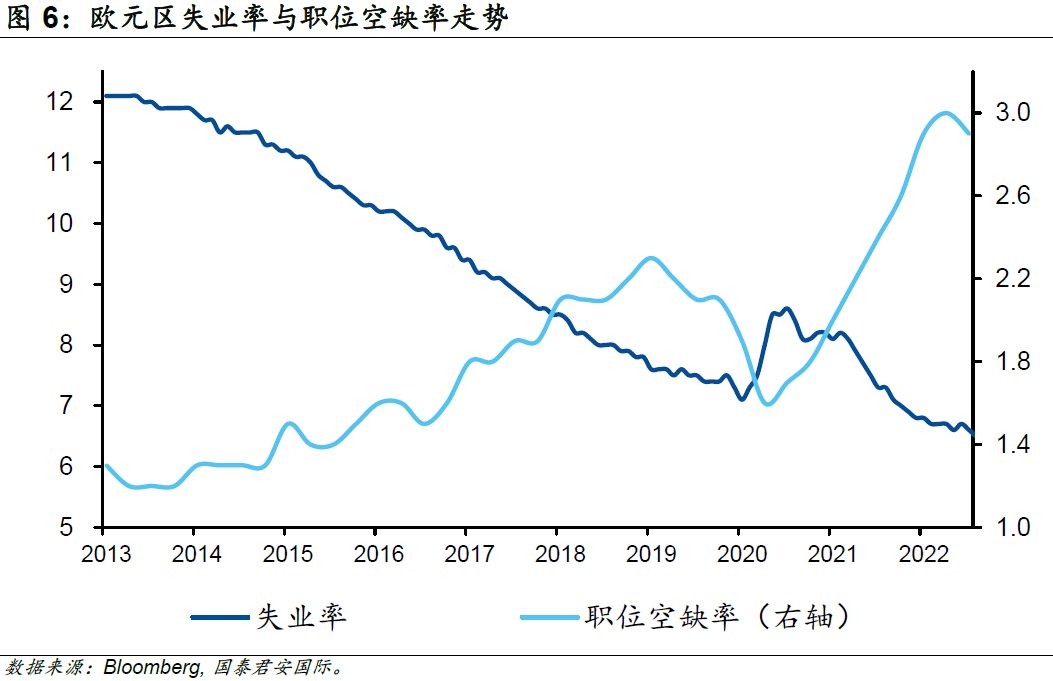 如果說天氣在很大程度上幫助了歐洲人,但歐洲經(jīng)濟(jì)超預(yù)期的根本原因大概率不是因為幸運或者天氣。進(jìn)一步來看,勞動力市場的火熱意味著經(jīng)濟(jì)維持著較好的動能。一方面,即使在能源價格高企的去年上半年,職位空缺率都處于上行趨勢中;另一方面,在緊張的企業(yè)用工環(huán)境中,歐元區(qū)的失業(yè)率開始走低,并迭創(chuàng)歷史低點。在之前通脹大幅高走的背景下,歐元區(qū)多個國家的工會已經(jīng)通過罷工的形式確定了未來的漲薪方案。與此同時,歐洲央行(ECB)基于通脹補(bǔ)償?shù)目紤],在2022年12月的最新預(yù)測中將2022-2024年的累積工資增長較2022年9月的預(yù)測值上調(diào)1.4個百分點。
