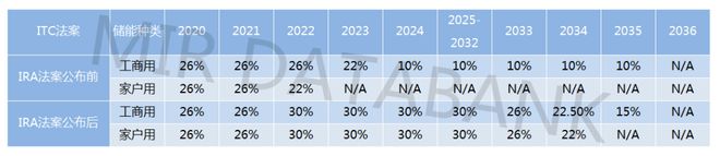 美國(guó)IRA法案出臺(tái),獨(dú)立儲(chǔ)能納入ITC補(bǔ)貼范圍,并將ITC補(bǔ)貼有效期將持續(xù)到2033年,并將抵免劃分為基礎(chǔ)抵免+額外抵免。其中基礎(chǔ)抵免額度由之前的26%上升至30%,此前為逐年退坡。具體變化情況如下表: