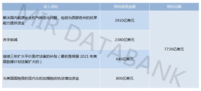 IRA法案的實(shí)施是政治家們的游戲,但透過(guò)政治博弈的波譎云詭,人們更關(guān)心的是法案本身到底在傳達(dá)什么信息。簡(jiǎn)單來(lái)說(shuō),IRA法案旨在通過(guò)減少赤字、降低處方藥價(jià)格、投資國(guó)內(nèi)能源生產(chǎn)以及促進(jìn)清潔能源產(chǎn)業(yè)來(lái)遏制通膨。以上的想法是偉大的,但是美國(guó)目前國(guó)家債務(wù)高筑,聯(lián)邦政府連年擴(kuò)大赤字,美國(guó)的國(guó)家總債務(wù)限額屢屢被觸及,需要提高債務(wù)上限。這項(xiàng)宏大的新能源投資刺激法案的錢從哪來(lái)?又被具體分配到哪些領(lǐng)域? 這些問(wèn)題由MIR睿工業(yè)通過(guò)對(duì)法案原文的解讀總結(jié)出下列圖表: