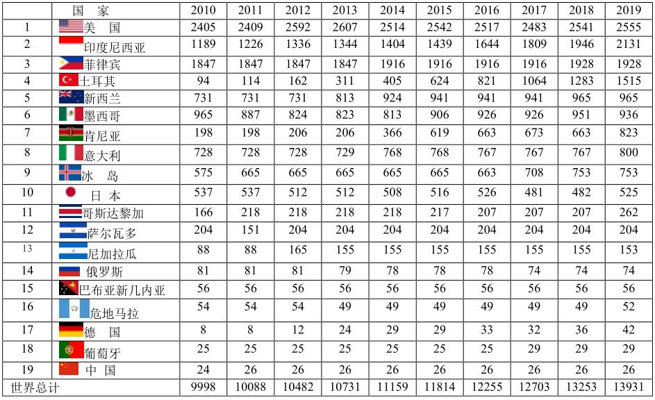 2019年占地熱裝機總?cè)萘孔疃嗟氖敲绹?18.3%)、印度尼西亞(15.3%)、菲律賓(13.8%)、土耳其(10.9%)、新西蘭(6.9%)。中國排序第19名,地熱裝機容量進展不大。