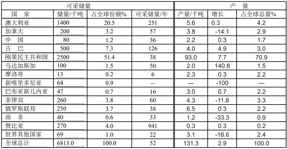 2021年底世界各國鈷的可采儲(chǔ)量和產(chǎn)量
