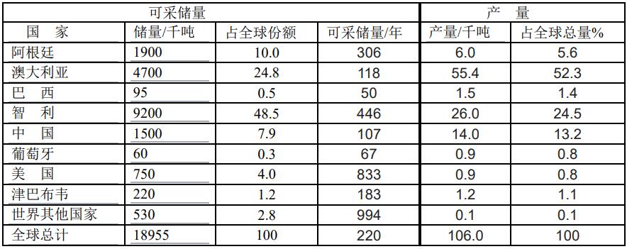 3、鋰:世界上鋰可采儲(chǔ)量最多的國家依次為智利、澳大利亞、阿根廷和中國,這四個(gè)國家總和占全球總量的91.2%。鋰生產(chǎn)量最多的國家為澳大利亞、智利和中國,這三個(gè)國家總和占全球總量的90%.