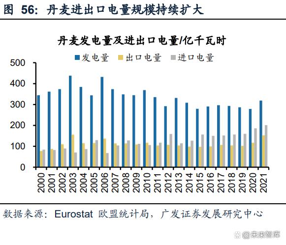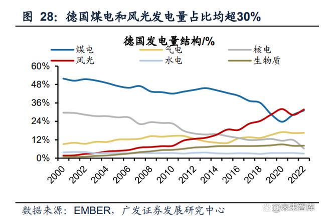 (1)丹麥,以煤為主到以風(fēng)光為主:2000年煤電發(fā)電量占比超40%,2022年降至 10.5%,風(fēng)光發(fā)電量占比已超60%,生物質(zhì)發(fā)電占比23%,丹麥主要依靠與鄰國電網(wǎng) 互聯(lián),挪威和瑞典均是水電富余國家,通過電量進出口調(diào)節(jié)國內(nèi)電量消納,所以風(fēng) 光占比高仍然沒有出現(xiàn)消納問題;