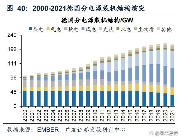 新能源滲透率提升的同時,德國保留一定火電裝機用于調(diào)峰。與丹麥不同,德國在 風(fēng)光發(fā)電量提升的同時,始終保留一定的煤電、并新增一批氣電裝機解決風(fēng)光消納 問題,這與德國資源稟賦有關(guān),德國是歐盟最大的煤炭產(chǎn)出國,2021年德國煤炭產(chǎn)量占歐盟的38%,這與我國頗為相似。2000-2021年德國煤電和氣電裝機占比從63.3% 降低至29.2%,風(fēng)光裝機占比從6.0%提升至58.7%,新增裝機主要由風(fēng)光貢獻。發(fā)電 量結(jié)構(gòu)來看,2000-2021年德國煤電和氣電發(fā)電量占比從61.0%降低至44.6%,風(fēng)光 發(fā)電量占比從1.6%提升至28.2%,火電仍然保持了一定比例用于調(diào)峰。