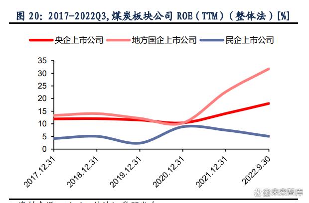 ROE 數(shù)據(jù)方面,煤炭地方國企上市公司表現(xiàn)優(yōu)于央企上市公司。受益于煤炭價格的提升, 資產(chǎn)收益率在 2020 年后迎來了大幅度增長。民企上市公司整體表現(xiàn)弱勢,ROE 呈下降趨 勢,遠(yuǎn)低于國企央企表現(xiàn)。PB 估值方面,2020 年后隨著企業(yè)經(jīng)營效益改善和煤炭板塊整體 股價的提升,國企央企上市公司的該項指標(biāo)也有一定程度的增長,走勢與 ROE 接近。但考 慮到 ROE 的增長幅度更為明顯,我們認(rèn)為 PB 的增長仍不足以完全反應(yīng)企業(yè)效益增長的速 度。而煤炭行業(yè)在能源政策導(dǎo)向調(diào)整與電力市場化加速推進背景下,疊加新一輪煤礦產(chǎn)能周 期,供需或?qū)㈤L期趨緊,煤炭公司的高收益有望維持,內(nèi)在價值有望逐漸被市場認(rèn)可,估值 有望迎來進一步修復(fù)。