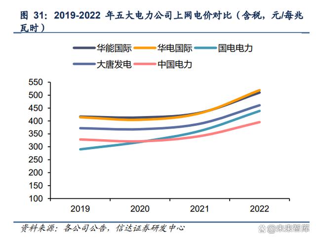 2022 年五大電上網(wǎng)電價(jià)同比上漲明顯,上浮幅度普遍在 18%-20%。2022 年,五大電的煤 電上網(wǎng)電價(jià)普遍實(shí)現(xiàn)上浮,而由于傳統(tǒng)能源裝機(jī)比重較大,2022 年國電電力和華電國際綜合上網(wǎng)電價(jià)的上浮最為顯著,其中國電電力上網(wǎng)電價(jià)達(dá)到 438.88 元/兆瓦時(shí),同比漲幅 21.5%,華電國際上網(wǎng)電價(jià)達(dá)到 519.25 元/兆瓦時(shí),同比漲幅 20.8%。隨著我國市場化電價(jià) 機(jī)制的進(jìn)一步完善,電價(jià)上浮空間未來有望逐步打開。