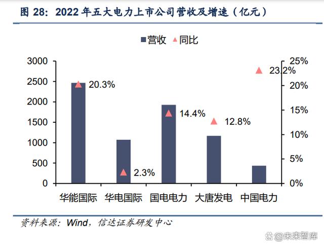 2022 年主要受益于電價(jià)上漲,我國五大電力上市公司的營業(yè)收入均實(shí)現(xiàn)穩(wěn)步增長。其中, 華能國際實(shí)現(xiàn)營收 2467.3 億元,同比增長 20.3%;國電電力實(shí)現(xiàn)營收 1926.8 億元,同比 增長 14.4%;大唐發(fā)電實(shí)現(xiàn)營收 1168.3 億元,同比增長 12.8%;中國電力規(guī)模較小,營收 增速最快,2022 年實(shí)現(xiàn)營收 436.9 億元,同比增長 23.2%。 2022 年五大電盈虧分化明顯,歸母凈利潤均實(shí)現(xiàn)向上修復(fù)。2022 年國電電力(火電資產(chǎn) 優(yōu)質(zhì),長協(xié)煤基本全覆蓋)、中國電力(火電資產(chǎn)優(yōu)質(zhì),大力提升新能源裝機(jī)占比)分別 實(shí)現(xiàn)歸母凈利潤 27.47 億元、26.85 億元,同比增幅分別達(dá)到 239.6%、297.1%;華電國際 小幅盈利,實(shí)現(xiàn)歸母凈利潤 0.998 億元,同比增長 102.2%;大唐發(fā)電小幅虧損,歸母凈利 潤為-8.71 億元,同比減虧 110.25 億元;華能國際虧損達(dá) 100.85 億元,同比實(shí)現(xiàn)減虧 25.88 億元。