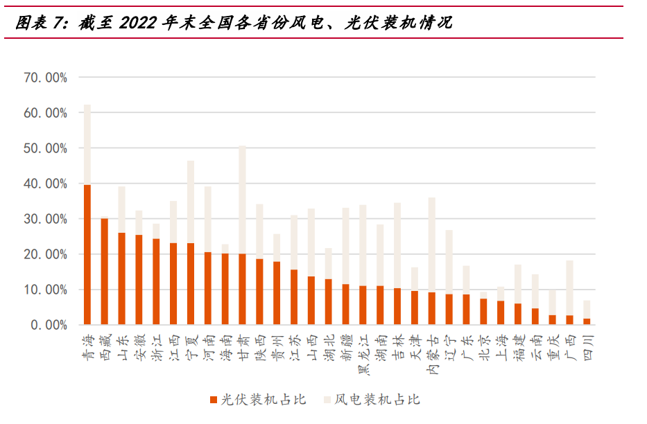 截至 2022 年末,全國各省風電、光伏裝機量占各省總裝機量比例前五名的為青 海、西藏、河北、寧夏、安徽(按光伏裝機排序);全國各省風電、光伏發(fā)電量占各 省總發(fā)電量比例前五名的為青海、西藏、寧夏、甘肅、山東。 考慮到新能源滲透率與分時電價特征高度相關,因此全國多個省份均可出現(xiàn)類似 山東省的電價分時特征,如青海、寧夏、甘肅等。