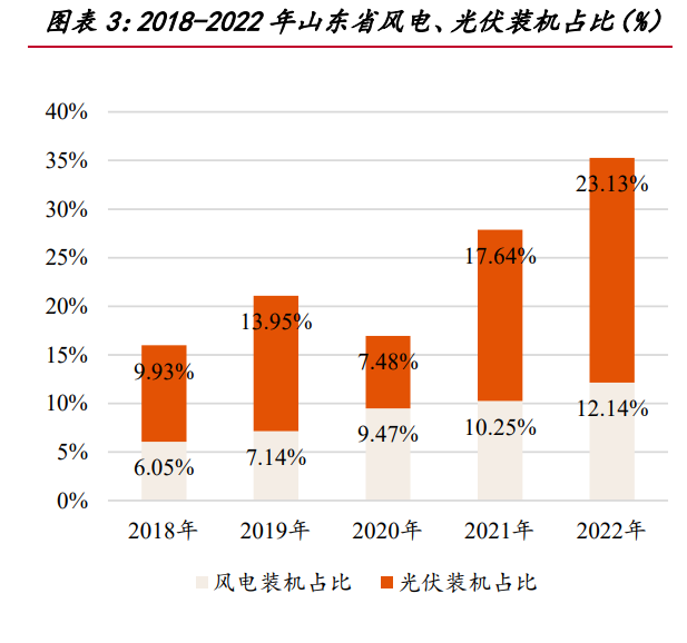 在新能源占比較高的地區(qū),相應時段電價較低。由于新能源發(fā)電邊際成本低的特 質(zhì),在新能源高發(fā)期間,如果用電需求較低,則相應時段市場電價較低。以山東省電 力現(xiàn)貨市場為例: 2018-2022 年,山東省風電、光伏裝機容量及發(fā)電量持續(xù)增長,風電、光伏裝機 容量自 1146/1361 萬千瓦增長至 2302/4270 萬千瓦,CAGR 達 14.97%/25.69%,風電、 光伏裝機占總裝機量比例自 6.05%/9.93%擴張至 12.14%/23.13%;風電、光伏發(fā)電量 占總發(fā)電量比例自 2.32%/0.55%擴張至 5.28%/11.25%。