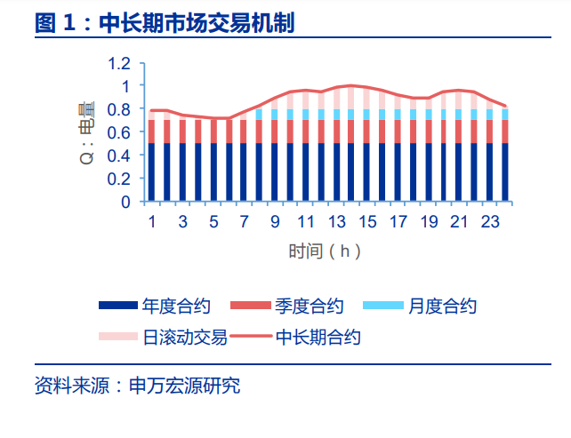 如果把上述五個(gè)方向繼續(xù)向下展開,涉及到的品種多達(dá)十幾種,紛繁復(fù)雜的電力交易 品種以及各不相同的機(jī)制提高了對(duì)電力市場(chǎng)研究的門檻。但從電力系統(tǒng)運(yùn)行的本質(zhì)來說, 不論是電能量市場(chǎng)、輔助服務(wù)市場(chǎng)還是容量電價(jià),大體上都是要實(shí)現(xiàn)兩個(gè)功能:有功平衡 和無功平衡。 有功平衡即電力系統(tǒng)需要保持發(fā)電功率和用電負(fù)荷時(shí)時(shí)刻刻相等。為了保證供電的可 靠性以及用電成本的穩(wěn)定性,用戶側(cè)需要提前安排和預(yù)測(cè)其未來的用電需求,發(fā)電側(cè)需要提前預(yù)測(cè)其未來出力情況(風(fēng)電、光伏、水電等)或安排發(fā)電計(jì)劃(化石能源),因此需 要提前簽訂用電合約來使供需平衡。但不論新能源的出力還是用電計(jì)劃,距離用電時(shí)間越 遠(yuǎn)把握性越小,所以根據(jù)簽訂合約時(shí)點(diǎn)與實(shí)際用電時(shí)點(diǎn)的遠(yuǎn)近,可以分為中長(zhǎng)期和現(xiàn)貨交 易,本質(zhì)目的是對(duì)電力合約進(jìn)行分解,使得電力合約與實(shí)際用電需求盡量匹配。 中長(zhǎng)期交易從時(shí)間尺度上可以分為年度合約、季度合約、月度合約等,現(xiàn)貨交易則主 要分為日前、日內(nèi)和實(shí)時(shí)現(xiàn)貨交易。將電能量市場(chǎng)根據(jù)時(shí)間尺度不同分解為不同的產(chǎn)品, 本質(zhì)上是在市場(chǎng)靈活性和交易成本之間取平衡,時(shí)間尺度越長(zhǎng)靈活性越差,交易成本越低, 反之則靈活性越強(qiáng)但交易成本越高。