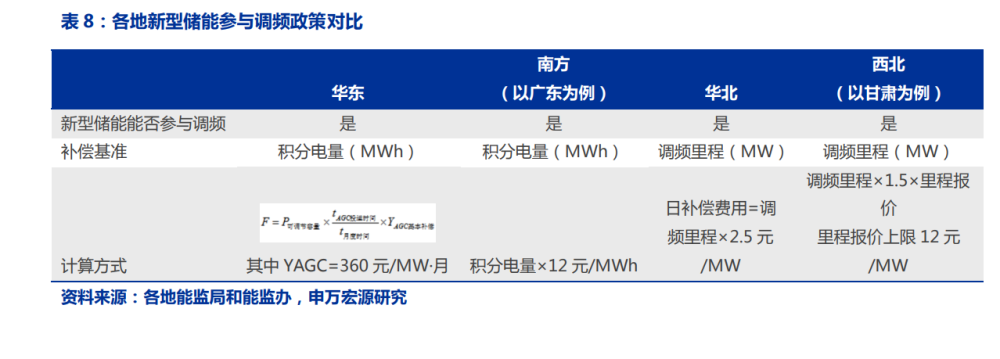 調(diào)頻輔助服務(wù)經(jīng)常因其名稱而讓人迷惑,但調(diào)頻輔助服務(wù)本質(zhì)上還是對電能量的調(diào)節(jié)。 調(diào)頻輔助服務(wù)理論上就是為了彌補調(diào)頻輔助服務(wù)是為了彌補電力市場和調(diào)峰輔助服務(wù)無法 解決的實時平衡問題,主要依靠自動控制技術(shù)來進行調(diào)整。 調(diào)頻已經(jīng)成為儲能的重要收入來源之一。各地陸續(xù)允許新型儲能參與調(diào)頻輔助服務(wù)市 場,而目前在多數(shù)地區(qū),調(diào)頻輔助服務(wù)已經(jīng)成為儲能最重要的收益來源。對于調(diào)頻輔助補 償基準(zhǔn),華東和南方區(qū)域采用積分電量(即調(diào)頻容量乘以調(diào)用時間),而華北和甘肅則采 用調(diào)頻里程(即調(diào)頻容量乘以調(diào)用次數(shù))。調(diào)頻補償?shù)挠嬎惴绞讲⒉恢匾?,重要的是看新型儲能參與調(diào)頻輔助服務(wù)相比于火電等傳統(tǒng)機組是否存在優(yōu)勢。華東、南方區(qū)域儲能與火 電相比,補償計算方式?jīng)]有任何區(qū)別。華北區(qū)域同等調(diào)頻里程情況下,儲能的補償費用僅 有火電的一半。而對于甘肅省,補償費用則高于火電。