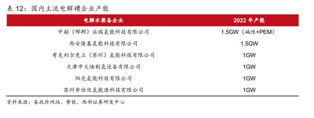 電解水制氫是指水分子在直流電作用下被解離生成氧氣和氫氣,分別從電解槽陽(yáng)極和陰極 析出。根據(jù)工作原理和電解質(zhì)的不同,電解水制氫技術(shù)通常分為四種,分別是堿性電解水 技術(shù)(ALK)、質(zhì)子交換膜電解水技術(shù)(PEM)、高溫固體氧化物電解水技術(shù)(SOEC)和 固體聚合物陰離子交換膜電解水技術(shù)(AEM)。 電解水制氫技術(shù)以堿性電解為主,PEM 電解次之。“雙碳”目標(biāo)提出后,國(guó)內(nèi)電解水制氫 項(xiàng)目規(guī)劃和推進(jìn)逐步加快,2022 年國(guó)內(nèi)堿性電解槽企業(yè)已披露產(chǎn)能接近 11GW,堿性電 解水制氫技術(shù)已完成商業(yè)化進(jìn)程,產(chǎn)業(yè)鏈發(fā)展成熟,且具備成本優(yōu)勢(shì),已實(shí)現(xiàn)大規(guī)模應(yīng)用; PEM 電解水技術(shù)則處于商業(yè)化初期,產(chǎn)業(yè)鏈國(guó)產(chǎn)化程度不足,電解槽雙極板、膜材料以及 鉑、銥等貴金屬催化劑材料成本更高且極度依賴進(jìn)口;高溫固體氧化物電解水技術(shù)和固體 聚合物陰離子交換膜電解水技術(shù)還處于研發(fā)示范階段,未實(shí)現(xiàn)商業(yè)化應(yīng)用。