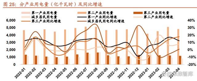 2023 年 4 月,全社會用電量 6901 億千瓦時,同比增長 8.3%。分產(chǎn)業(yè)看,第一產(chǎn)業(yè)用電量 88 億千瓦時,同比增長 12.3%;第二產(chǎn)業(yè)用電量 4814 億千瓦時,同比增長 7.6%;第三產(chǎn)業(yè)用電量 1155 億千瓦時,同比增長 17.9%;城鄉(xiāng) 居民生活用電量 844 億千瓦時,同比增長 0.9%。1-4 月,全社會用電量累計 2.81 萬億千瓦時,同比增長 4.7%。其 中,第一產(chǎn)業(yè)用電量 351 億千瓦時,同比增長 10.3%;第二產(chǎn)業(yè)用電量 1.86 萬億千瓦時,同比增長 5.0%;第三產(chǎn)業(yè) 用電量 4852 億千瓦時,同比增長 7.0%;城鄉(xiāng)居民生活用電量 4268 億千瓦時,同比增長 0.3%。 經(jīng)濟復(fù)蘇拉動用電量持續(xù)攀升,居民用電同比轉(zhuǎn)正。今年以來,在一系列穩(wěn)增長政策推動下,中國經(jīng)濟從壓力中轉(zhuǎn)暖, 一季度主要經(jīng)濟指標(biāo)企穩(wěn)回升,經(jīng)濟“向上”之形基本確立,有望持續(xù)鞏固。在經(jīng)濟加速回暖的背景下,4 月全社會 用電量增速(8.3%)環(huán)比 3 月(5.92%)有所提升,三大產(chǎn)業(yè)均維持了較高增速,其中服務(wù)業(yè)修復(fù)明顯,成為拉動全 社會用電量增長的主力軍。居民用電量在經(jīng)歷 2、3 月份的負增長后轉(zhuǎn)正,表明疫后復(fù)蘇已逐漸由生產(chǎn)端傳導(dǎo)至消費 端,全年經(jīng)濟增長動力進一步增強。