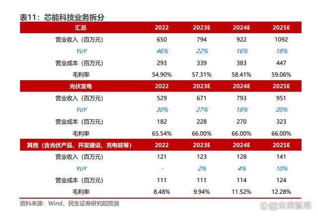 芯能科技業(yè)務(wù)拆分: 22 年業(yè)務(wù)結(jié)構(gòu)收入占比:光伏發(fā)電(81%)+光伏產(chǎn)品(12%)+開(kāi)發(fā)建設(shè)(4%) +充電樁(1%)+其他業(yè)務(wù)(1%)。其中光伏產(chǎn)品、開(kāi)發(fā)建設(shè)主要以配套光伏發(fā)電 業(yè)務(wù)為主。 光伏發(fā)電業(yè)務(wù):受益于大工業(yè)電價(jià)同比上調(diào)以及公司自持電站規(guī)模持續(xù)擴(kuò)大、光伏 發(fā)電量穩(wěn)步增加,同時(shí),在分布式光伏整縣推進(jìn)背景下,EPC 及運(yùn)維服務(wù)業(yè)務(wù)的市 場(chǎng)空間進(jìn)一步打開(kāi),公司光伏發(fā)電業(yè)務(wù)穩(wěn)定增長(zhǎng)。根據(jù)公司轉(zhuǎn)債問(wèn)詢(xún)函回復(fù),未來(lái) 三年公司計(jì)劃以分布式光伏并網(wǎng)裝機(jī)容量不低于 15%的年化增長(zhǎng)率持續(xù)擴(kuò)大自持分布式光伏電站建設(shè)投入,我們預(yù)計(jì)公司光伏發(fā)電業(yè)務(wù) 23-25 年收入增速分別為 27%/18%/20%。